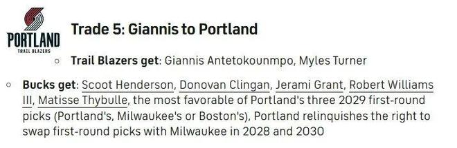 這段時(shí)間,開(kāi)拓者竟然屢次傳出了跟字母哥的“緋聞”。近日知名美媒CBS體育又為開(kāi)拓者提供了一筆交易方案,即他們得到字母哥+特納,送出亨德森+克林根+格蘭特+羅威+塞布爾+三個(gè)29年首輪簽中順位最優(yōu)的簽位,同時(shí)放棄28年以及30年與雄鹿的首輪簽互換權(quán)。