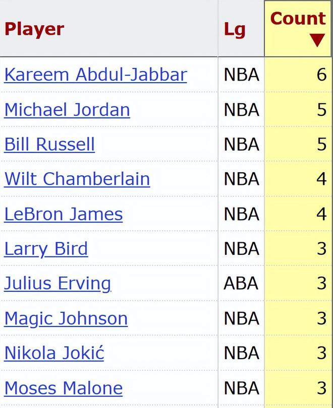 三項(xiàng)MVP榜單排名第一,充分說(shuō)明了約基奇目前的統(tǒng)治力和被看好程度。如果約基奇本賽季能再次當(dāng)選MVP,那將是他第4次獲此殊榮,在NBA歷史上能至少獲得4次常規(guī)賽MVP的球員目前只有5位,分別是張伯倫和詹姆斯(4次)、比爾-拉塞爾和喬丹(5次)、賈巴爾(6次)。約基奇有機(jī)會(huì)追平張伯倫和詹姆斯。