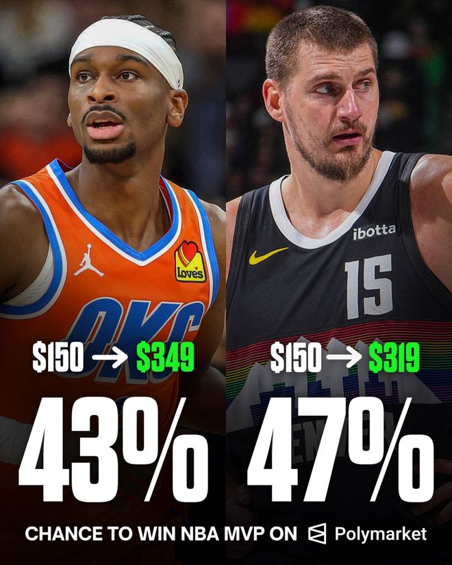 然后是Polymarket的MVP概率預(yù)測(cè)榜,之前亞歷山大是排名第一的球員,但年終大戰(zhàn)后,約基奇獲得MVP的概率上升至47%,亞歷山大在6戰(zhàn)4敗后,已經(jīng)下降到43%。這樣的變化,同樣說(shuō)明了約基奇當(dāng)選MVP的可能性明顯提升。